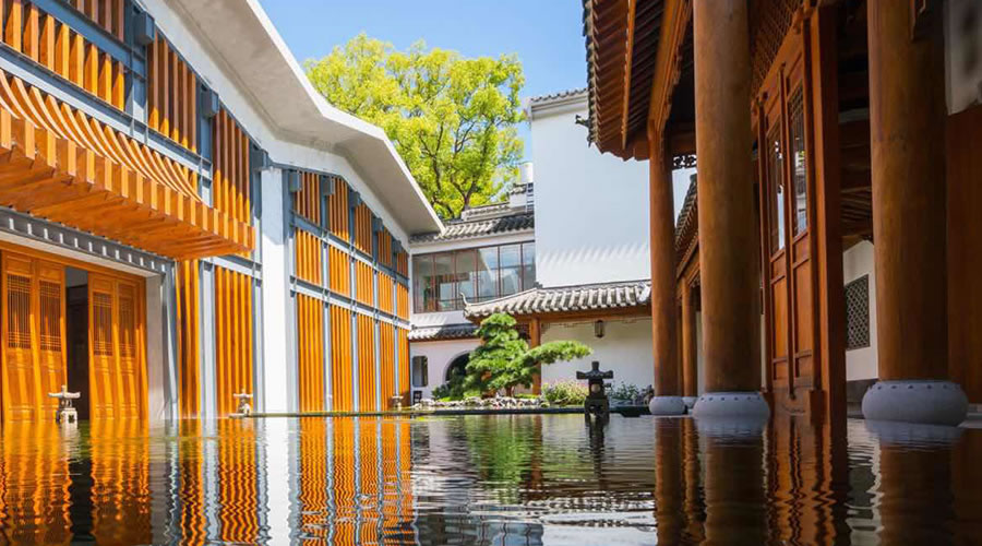 园内古树参天、花草茂盛、回廊曲径、设山引水,充分体现园主人对人与自然和谐相处的现代理念。