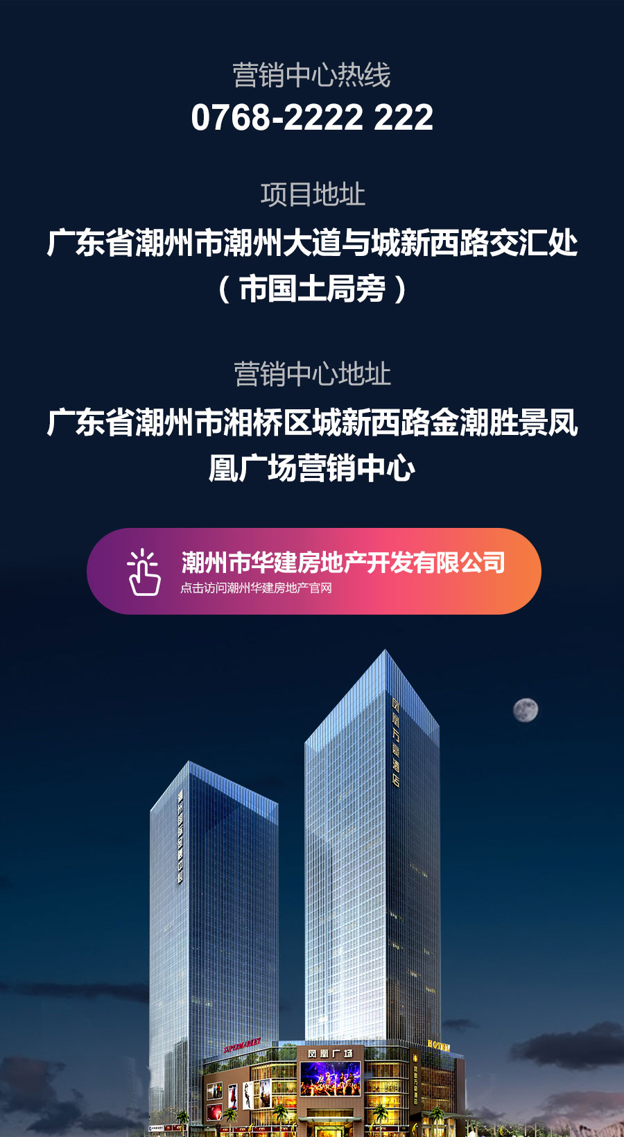 作为省市重点建设项目和旅游重大配套项目,我们立足于高起点规划、高标准建设、高效率运营、高智能化管理,坚持社会效益、经济效益和环境效益并重,目标打造成为城市CBD核心区;项目主塔楼高150米,宏大气派,引入国际万豪酒店集团经营管理,西塔楼瞄准国际甲级5A标准写字楼,专为各类企业量身定做,裙楼集中商业,招纳国际国内一线品牌,汇集精品百货、大型餐饮、潮州小吃、巨幕影院、KTV、儿童乐园等业态,整体配置近59部国际品牌电梯,联通各个楼层和大型地下停车场,建成后能为社会提供约1万个工作岗位,并为市民和来潮州旅游光观及商务活动人士提供一站式服务,凤凰广场必将成为粤东新高度,潮州城市新地标。